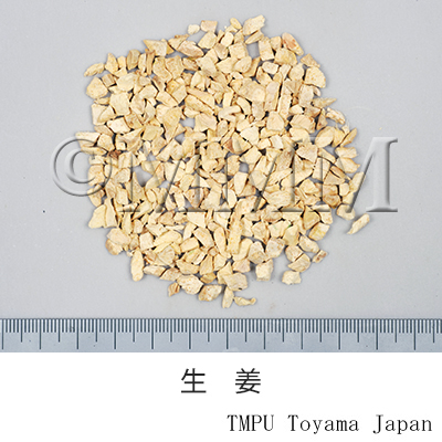 備考古来,漢方処方で用いられる生姜は,いわゆる新鮮なショウガのことで,乾姜は乾燥品である.したがって,漢薬市場の乾燥した生姜(乾生姜とも称す)は,漢方でいう乾姜を指す.では市場の乾姜は何かというと,生姜を蒸乾したもので,修治品(加工品)といえる.一方,現在中国では新鮮なものが生姜で,乾燥品が乾姜である.また修治品として炮姜がある.炮姜は先ずきれいな砂(蛤粉,滑石粉)を鍋に入れ,強火で熱した後,乾燥した皮付き生姜を入れて攪拌し,表面が盛り上がって褐色になったら取出し放冷したものである.