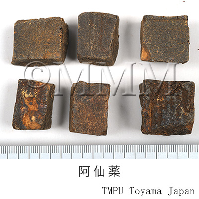 | 選品 | 褐色~黒褐色で砕きやすいものが良く,薬用には2~2.5cm角のサイコロ状に切ったものを使用する (TN). | |||