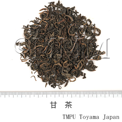 | 備考 | 葉はもんでやや発酵させたもので,加工過程上ちぢれている.生の葉には甘味は無く,発酵させ手でもむ等の調製により,加水分解生成物 phyllodulcin (甘味成分) が生じる.アマチャは江戸時代にその煎汁を灌仏会 (4月8日) の甘茶湯として用いたもので,薬用の歴史は浅い. | |||||
