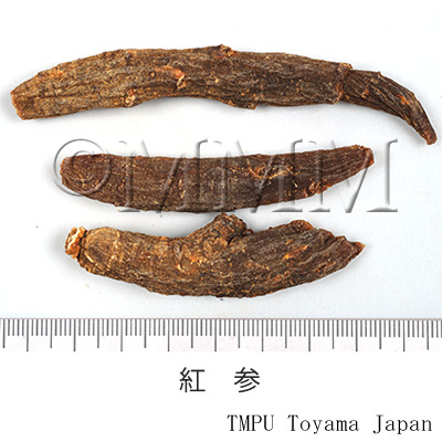 | 備考 | 細根をつけたまま蒸し上げ乾燥したもの(日本産紅参)と,細根を除去し乾燥し圧したもの(北鮮,韓国産紅参)とがある.中国では比較的長い分枝根を付けてかこうしたものを「辺条紅参」,細根を除去して加工したものを「紅参須」と称する. | |||
