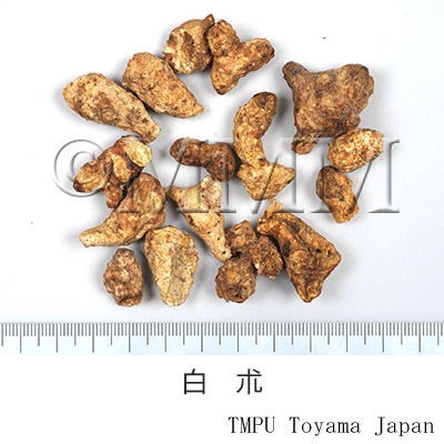 備考日本及び韓国産は Atractylodes japonica の根茎の周皮を除いたもので,「三好白朮」,「玉白朮」,「嫩根白朮」などと称する.中国産白朮はすべて Atractylodes macrocephala を基源とし,産地及び加工法の違いにより「浙朮」,「天生朮」,「冬朮」,「野朮」など多様な呼称がある.『中華人民共和国薬典』に規定される白朮 (Atractylodis Macrocephalae Rhizoma, Largehead Atractylodes Rhizome) はこのものである.日本産白朮を「和白朮」,中国産白朮を「唐白朮」ともいう.2種ともに精油の主成分は atractylone である.
