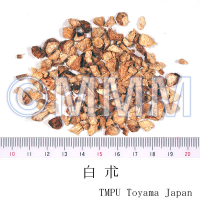 | 備考 | 日本及び韓国産は Atractylodes japonica の根茎の周皮を除いたもので,「三好白朮」,「玉白朮」,「嫩根白朮」などと称する.中国産白朮はすべて Atractylodes macrocephala を基源とし,産地及び加工法の違いにより「浙朮」,「天生朮」,「冬朮」,「野朮」など多様な呼称がある.『中華人民共和国薬典』に規定される白朮 (Atractylodis Macrocephalae Rhizoma, Largehead Atractylodes Rhizome) はこのものである.日本産白朮を「和白朮」,中国産白朮を「唐白朮」ともいう.2種ともに精油の主成分は atractylone である. 白朮とその同類生薬である蒼朮の薬効については,その健脾,燥湿を目的とするのは同じであるが,白朮は健脾(健胃)の力が比較的強く,蒼朮は燥湿(利水,利尿,発汗)の力が優るとされている.そのため,脾弱の虚証には白朮を用い,温盛の実証には蒼朮を多く用いる. | |||||