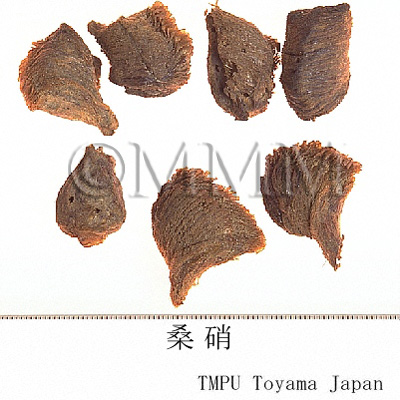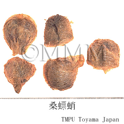 | 備考 | カマキリ科/Mantidaeの次の4種が原昆虫とされている. 1.オオカマキリ, 大刀螂 Paratenodera sinensis de Saussure (恐らく団螵蛸), 2.コカマキリ, 小刀螂 Statilia maculata Thunberg (恐らく黒螵蛸), 3.ウスバカマキリ, 薄翅蟷螂 Mantis religiosa L., 4.ハラビロカマキリ, 巨斧蟷螂 Hierodula patellifera Serville (恐らく長螵蛸) の卵蛸を乾燥したもの. 桑螵蛸には次の3種がある. 1.団螵蛸 (軟螵蛸): 団塊状を呈し,底面平坦,上面は半円形をなし,隆起帯は不鮮明である.長さ約2.5~4cm,幅2~3cm,表面は淡黄褐色または黄褐色.軽質で柔らかく,靭性あり.断面をみると,最外層は海綿上状で,その内部は多くの放射状に排列した小室があり,各室に楕円形の卵がある. 2.長螵蛸 (硬螵蛸): 長條形を呈し,底面は平坦または凹入し,上面は凸面状で,その上に帯状隆起があり,両側に1本の褐色または灰褐色の浅い溝がある.一端は他端に比し著しく細くて長い.長さは約2.5~5cm,幅約1~1.5cm,厚さ約1cm.表面は灰褐色で全体に平行した斜紋がある.質は硬く,脆い.断面は13~14列の小型卵室があり,放射状に排列する. 3.黒螵蛸: 長螵蛸と似ているが,底面は平らで上面は円形,中部は微かに隆起し,尖端に近い所で僅かに浮き上がっている.表面は紫がかった褐色で,平行の斜紋があり,質は堅く,靭性もあり,折れ難い.断面は卵室が放射状に並ぶ. | |||||