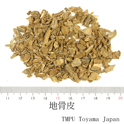 | 備考 | 市場では産地によって商品規格が定められている. (1) 南骨皮(杜骨皮):江蘇省蘇州~上海近郊産,品質良好. (2) 江北骨皮:江蘇省北部産,品質次品. (3) 古城骨皮:安徽省除県産,品質やや劣る. (4) 津骨皮:山西,河北,河南省産,劣品. クコの果実「枸杞子」は補腎薬,根皮「地骨皮」は清熱薬であり,効能が異なる. | |||||