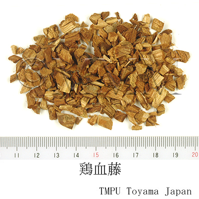 | 備考 | 広東,広西の一部の地区では,マメ科の Millettia nitida Benth. の茎を鶏血藤,血節藤,血藤,血筋藤などと称する.また江西省の豊城,雲南省鳳慶,四川省などに産する鶏血藤は Millettia dielsiana Harms の茎であり,豊城鶏血藤(江西),貫腸血藤(四川)とも称する.その他鶏血藤と称する商品は非常に種類が多い. 江西,陜西,河北,山東,山西,内蒙古,東北諸省などでは 血藤科/Sargentodoxaceae の Sargentodoxa cuneata (Oliv.) Rehd. et Wils. (= Holboellia cuneata Oliv.) 大血藤の茎を「鶏血藤」として用いる場合があるが,このものは元来大血藤,紅藤,活血藤,大活血,花血藤,血藤,血木通などと称するもので,混用すべきものではない. | |||||