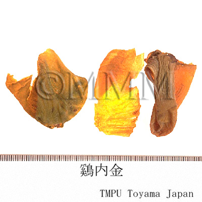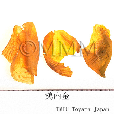 | 備考 | 中国ではニワトリの各種品種として「九斤鶏」,「狼山鶏」(岔河大鶏),「寿光鶏」,「大骨鶏」(大鶏, 高装鶏),「北京油鶏」,「桃源鶏」,「浦東鶏」(三黄鶏, 塘鶏),「来亨鶏」,「澳州黒鶏」などがある.香港市場品は恐らく「寿光鶏」(広東省産)のものであろう. 別名として「鶏肫皮」(遼寧, 山西, 山東, 湖北, 河南),「鶏針皮」(河北),「鶏中金」, 「化石胆」, 「化骨胆」(山西),「鶏合子」,「鶏膍胵」(山東),「鶏胃皮」(甘粛),「鶏食皮」,「鶏肚子」(河南),「鶏膆子」(新彊),「鶏灰皮」(江西),「鶏内筋」, 「鶏くん殻」(四川),「鶏肫子」(陜西),「鶏黄皮」(広西)などがある.ある地区では アヒル Anas platyrhnchos L. var. domesticus L. の胃の内壁である「鴨内金」を鶏内金にあてることがあるが,偽品である. | |||||