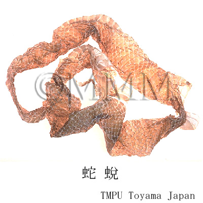 | 備考 | 本品はスジオナメラ Elaphe taeniurus Cope (黒眉錦蛇, 黄長虫, 慈鰻, 黄頷蛇), シュウダ E. carinata Gunther (錦蛇,臭蛇), アカマダラ Dinodon rufozonatum Cantor (赤鏈蛇), Zaocys dhumnades Contor (烏風蛇, 黄風蛇, 烏花蛇, 黒風蛇, 剣脊烏梢蛇, 黒花蛇)などのぬけ殻(脱皮膜)を乾燥したもの. 日本産のものは アオダイショウ Elaphe climacophora Boie, シマヘビ E. quadrivirgata Boie, ヤマカガシ Rhabodophis tigrinus Boie などの脱皮膜である. | ||||