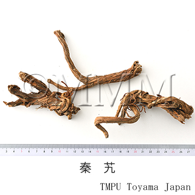 | 備考 | Gentiana macrophylla Pall.は(秦艽,四秦艽,西大艽 ,大秦艽,大艽,蘿卜艽,左秦艽,左艽),G. decumbens L.は(小秦艽),G. dahurica Fisch. は(小秦艽,狗秦艽,狗尾艽,山秦艽)と称される. 非正品や偽品の種類が多い.内蒙古産の「大艽」,「黒大艽」はキンポウゲ科の Aconitum unbrosum Komarov 又は A. sibiricum Poir. の根で,正品の秦艽のように根がねじれている.四川省産の「紅秦艽」はシソ科の Salvia przewalskii Maxim. の根. 韓国産秦艽はキンポウゲ科の Aconitum loczyanum Rapaics レイジンソウ亜属の根.かつて日本市場で流通していた和秦艽はキンポウゲ科のオキナグサ Pulsatilla cerunua (Thunb. ex Murray) Bercht. et Opiz. の根で偽品であった. | ||||||