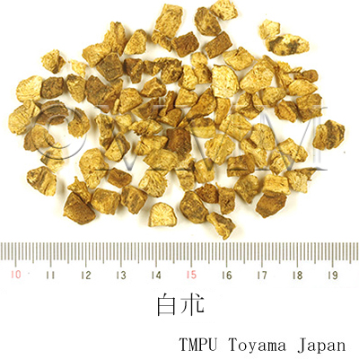 | 備考 | 日本及び韓国産は Atractylodes japonica の根茎の周皮を除いたもので,「三好白朮」,「玉白朮」,「嫩根白朮」などと称する.中国産白朮はすべて Atractylodes macrocephala を基源とし,産地及び加工法の違いにより「浙朮」,「天生朮」,「冬朮」,「野朮」など多様な呼称がある.『中華人民共和国薬典』に規定される白朮 (Atractylodis Macrocephalae Rhizoma, Largehead Atractylodes Rhizome) はこのものである.日本産白朮を「和白朮」,中国産白朮を「唐白朮」ともいう.2種ともに精油の主成分は atractylone である. 白朮とその同類生薬である蒼朮の薬効については,その健脾,燥湿を目的とするのは同じであるが,白朮は健脾(健胃)の力が比較的強く,蒼朮は燥湿(利水,利尿,発汗)の力が優るとされている.そのため,脾弱の虚証には白朮を用い,温盛の実証には蒼朮を多く用いる. | |||||