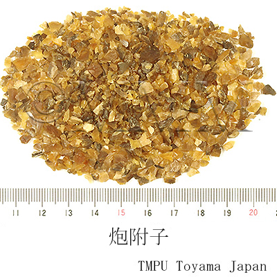 - 炮附子: 塩附子の外皮を剥ぎ2縦割して乾燥したもの.