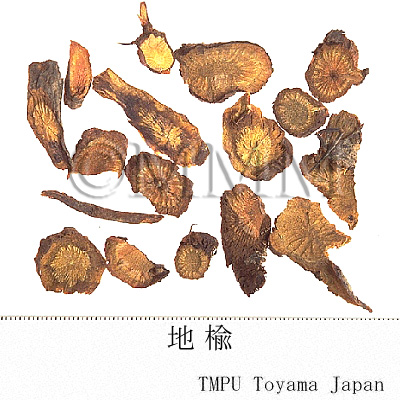 | 備考 | 地楡の原植物である Sanguisorba officinalis の変種には,var. longifolia (Bert.) Yu et Li の他,var. carnea (Fisch.) Regel ex Maxim. エゾワレモコウ,var. glandulosa (Kom.) Worosch,var. longifolia (Kitag.) Yu et Li が含まれる.これらの他,中国東北地区では S. tenuifolia Fisch. ex Link 及びナガボノシロワレモコウ S. tenuifolia Fisch. ex Link var. alba Trautv. et Meyer ,山東省烟台地区では S. applanata Yu et Li 及びその変種,寧夏地区の一部では S. alpina Bunge の根を 「地楡」 として薬用にしている.また貴州省貴陽地区では,タデ科/Polygonaceae の イブキトラノオ Polygonum bistorta L. の根茎を 「地楡」 と称しており,四川省南部では イタドリ Polygonum cuspidatum Sieb. et Zucc. の根茎を 「土地楡」 と称している. その他,河南省信陽ではユキノシタ科/Saxifragaceae の Astilbe chinensis Maxim. ex Fr. et Sav. の根茎を,雲南省昆明地区ではフクロソウ科/Geraniaceae の Geranium strictipes Kunth の根を 「紫地楡」 または 「赤地楡」 と称している.さらに雲南省の一部では,バラ科/Rosaceae の Potentilla peduncularis D. Don 及び P. siemersiana Lehm. の根を 「白地楡」 と称している.すべて地楡としては誤用である. 韓国市場の地楡 (Jiyu) 市場品は多くが S. officinalis L.,S. officinalis L. var. longifolia (Bert.) Yu et Li 及び S. tenuifolia Fisch. ex Link var. alba Trautv. et Meyer の根の混合品であった(B1). | |||||