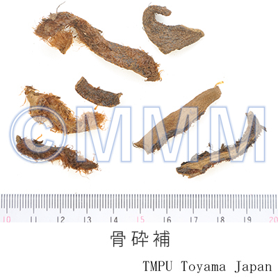 | 備考 | ウラボシ科/Polypodiaceaeの ハカマウラボシ Drynaria fortunei (Kunze) J. Smith の根茎を乾燥したもの(四川省で巴岩姜,吊蘭,屋檐姜,巴毛風,石鶏兒,湖南省や貴州省で爬崖姜,広西省で馬騮姜と称する)が主で,その他 D. sinica Diels (陜西省で猴姜,甘粛省で毛兒姜,駱駝と称する), D. propinqua (Wall.) J. Smith var. mesosoria Christ (四川省で爬岩姜, 石岩姜, 骨砕補と称する), Pseudodrynaria coronans (Wall.) Ching (広西省で骨砕補と称する) などの根茎も用いられる.一般に中国では根茎の鱗片を除去したものを「骨砕補」と称し,鱗片をつけたままのものを「申姜」または「猴姜」と称している. なお, 広西省僮族自治区葯物研究所の方鼎(1962年)は広西省産骨砕補の原植物を調査し, ウラボシ科/Polypodiaceaeの Phymatodes lucida (Roxb.) Ching (広西靖西で猴子姜,骨砕補), シノブ Davallia mariesii Moor., D. austro-sinica Ching, D. formosana Hayata, Drynaria bonii Christ, アリサンデンダ Polypodium amoenum Wall., Colysis elliptica (Thunb.) Ching var. pothifolia (Don) Ching, アリサンオウレンシダ Leucostegia immersa (Wall.) Presl. 広西で骨砕補), Davallia bullata Wall. (広西陸川で骨砕補,砕補), Leucostegia perdurans C. Christ (雲南昆明で骨砕補) を報告している. | |||||