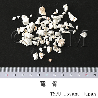 | 備考 | 中国では龍骨を商品上,「花龍骨(五花龍骨)」と「土龍骨」に大別している。 「花龍骨」は華東地区に主産し,表面淡灰白色~淡褐色を帯びた灰色を呈し,灰黒色,褐色,黄色あるいは青色などの斑紋,條紋または松葉紋様の花紋がみられ,質はやや硬いが破砕し易く,容易に崩れて粉末状となる。 「土龍骨」は華北,東北地区に主産し,表面に花紋がなく,断面は中空あるいは多孔質で,質は堅硬で破砕しにくいが,破砕すると小片状となる。「花龍骨」を上品とする。わが国に輸入されているものは主に「土龍骨」である。 | |||