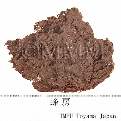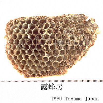 | 備考 | 現在の商品規格には次の3種がある. 1) 胡蜂房: 胡蜂(野蜂)窩で色白く軟質.偏平な形のものが良品とされる.若い巣で大きく,硬質,ラッパ状のもの,または樓蜂房という. 2) 露蜂房: 露天の箇所で採集された蜂房で,質の柔らかいものが最良である.山洞中の蜂房は色黒く,厚く固まり,品質はやや落ちる. 3) 細蜂房: 小さく背面に多数の黄色横紋がある蜂窩.形は長く,房孔は斜め上向き,色白く軟質である.これは良質で,楡樹の上に多い.蜂房の品質を鑑別するには,その品物が乾燥し,色白く,質は綿のように軽く軟らかく,指でつまむと弾力性があり,中に卵,幼虫,蛹その他の雑質物がないものを良品とする.もし,房内に木質物や草質物があり,質が脆く,あるいは房孔の大きなものは不合格品である.貯蔵には乾燥した通気性の良いところを選び,圧力を加えてはならない. | |||||