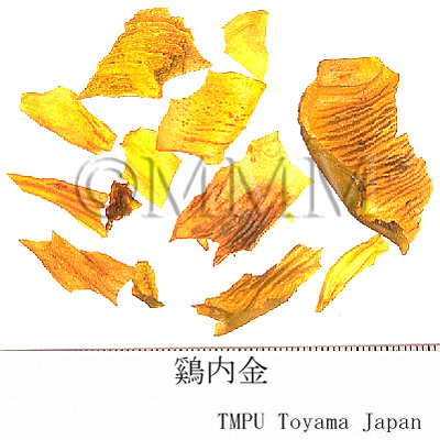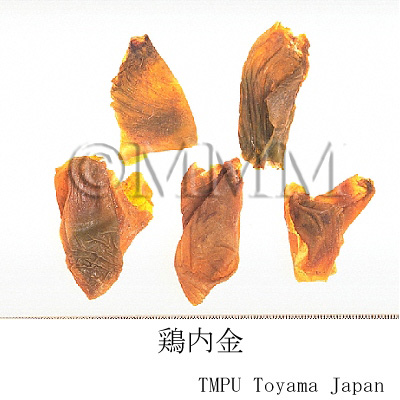 | 備考 | 中国ではニワトリの各種品種として「九斤鶏」,「狼山鶏」(岔河大鶏),「寿光鶏」,「大骨鶏」(大鶏, 高装鶏),「北京油鶏」,「桃源鶏」,「浦東鶏」(三黄鶏, 塘鶏),「来亨鶏」,「澳州黒鶏」などがある.香港市場品は恐らく「寿光鶏」(広東省産)のものであろう. 別名として「鶏肫皮」(遼寧, 山西, 山東, 湖北, 河南),「鶏針皮」(河北),「鶏中金」, 「化石胆」, 「化骨胆」(山西),「鶏合子」,「鶏膍胵」(山東),「鶏胃皮」(甘粛),「鶏食皮」,「鶏肚子」(河南),「鶏膆子」(新彊),「鶏灰皮」(江西),「鶏内筋」, 「鶏くん殻」(四川),「鶏肫子」(陜西),「鶏黄皮」(広西)などがある.ある地区では アヒル Anas platyrhnchos L. var. domesticus L. の胃の内壁である「鴨内金」を鶏内金にあてることがあるが,偽品である. | |||||