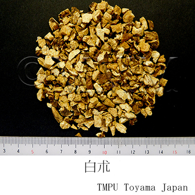 | 備考 | 日本及び韓国産は Atractylodes japonica の根茎の周皮を除いたもので,「三好白朮」,「玉白朮」,「嫩根白朮」などと称する.中国産白朮はすべて Atractylodes macrocephala を基源とし,産地及び加工法の違いにより「浙朮」,「天生朮」,「冬朮」,「野朮」など多様な呼称がある.『中華人民共和国薬典』に規定される白朮 (Atractylodis Macrocephalae Rhizoma, Largehead Atractylodes Rhizome) はこのものである.日本産白朮を「和白朮」,中国産白朮を「唐白朮」ともいう.2種ともに精油の主成分は atractylone である. 白朮とその同類生薬である蒼朮の薬効については,その健脾,燥湿を目的とするのは同じであるが,白朮は健脾(健胃)の力が比較的強く,蒼朮は燥湿(利水,利尿,発汗)の力が優るとされている.そのため,脾弱の虚証には白朮を用い,温盛の実証には蒼朮を多く用いる. | |||||