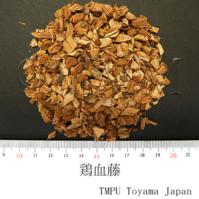 | 備考 | 広東,広西の一部の地区では,マメ科の Millettia nitida Benth. の茎を鶏血藤,血節藤,血藤,血筋藤などと称する.また江西省の豊城,雲南省鳳慶,四川省などに産する鶏血藤は Millettia dielsiana Harms の茎であり,豊城鶏血藤(江西),貫腸血藤(四川)とも称する.その他鶏血藤と称する商品は非常に種類が多い. 江西,陜西,河北,山東,山西,内蒙古,東北諸省などでは 血藤科/Sargentodoxaceae の Sargentodoxa cuneata (Oliv.) Rehd. et Wils. (= Holboellia cuneata Oliv.) 大血藤の茎を「鶏血藤」として用いる場合があるが,このものは元来大血藤,紅藤,活血藤,大活血,花血藤,血藤,血木通などと称するもので,混用すべきものではない. | |||||