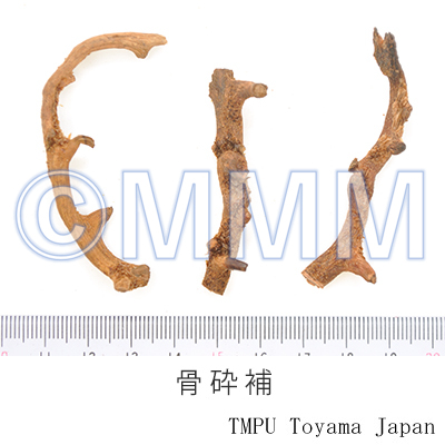 | 備考 | ウラボシ科/Polypodiaceaeの ハカマウラボシ Drynaria fortunei (Kunze) J. Smith の根茎を乾燥したもの(四川省で巴岩姜,吊蘭,屋檐姜,巴毛風,石鶏兒,湖南省や貴州省で爬崖姜,広西省で馬騮姜と称する)が主で,その他 D. sinica Diels (陜西省で猴姜,甘粛省で毛兒姜,駱駝と称する), D. propinqua (Wall.) J. Smith var. mesosoria Christ (四川省で爬岩姜, 石岩姜, 骨砕補と称する), Pseudodrynaria coronans (Wall.) Ching (広西省で骨砕補と称する) などの根茎も用いられる.一般に中国では根茎の鱗片を除去したものを「骨砕補」と称し,鱗片をつけたままのものを「申姜」または「猴姜」と称している. なお, 広西省僮族自治区葯物研究所の方鼎(1962年)は広西省産骨砕補の原植物を調査し, ウラボシ科/Polypodiaceaeの Phymatodes lucida (Roxb.) Ching (広西靖西で猴子姜,骨砕補), シノブ Davallia mariesii Moor., D. austro-sinica Ching, D. formosana Hayata, Drynaria bonii Christ, アリサンデンダ Polypodium amoenum Wall., Colysis elliptica (Thunb.) Ching var. pothifolia (Don) Ching, アリサンオウレンシダ Leucostegia immersa (Wall.) Presl. 広西で骨砕補), Davallia bullata Wall. (広西陸川で骨砕補,砕補), Leucostegia perdurans C. Christ (雲南昆明で骨砕補) を報告している. | |||||