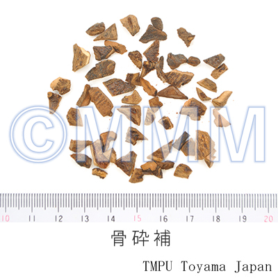 | 備考 | ウラボシ科/Polypodiaceaeの ハカマウラボシ Drynaria fortunei (Kunze) J. Smith の根茎を乾燥したもの(四川省で巴岩姜,吊蘭,屋檐姜,巴毛風,石鶏兒,湖南省や貴州省で爬崖姜,広西省で馬騮姜と称する)が主で,その他 D. sinica Diels (陜西省で猴姜,甘粛省で毛兒姜,駱駝と称する), D. propinqua (Wall.) J. Smith var. mesosoria Christ (四川省で爬岩姜, 石岩姜, 骨砕補と称する), Pseudodrynaria coronans (Wall.) Ching (広西省で骨砕補と称する) などの根茎も用いられる.一般に中国では根茎の鱗片を除去したものを「骨砕補」と称し,鱗片をつけたままのものを「申姜」または「猴姜」と称している. なお, 広西省僮族自治区葯物研究所の方鼎(1962年)は広西省産骨砕補の原植物を調査し, ウラボシ科/Polypodiaceaeの Phymatodes lucida (Roxb.) Ching (広西靖西で猴子姜,骨砕補), シノブ Davallia mariesii Moor., D. austro-sinica Ching, D. formosana Hayata, Drynaria bonii Christ, アリサンデンダ Polypodium amoenum Wall., Colysis elliptica (Thunb.) Ching var. pothifolia (Don) Ching, アリサンオウレンシダ Leucostegia immersa (Wall.) Presl. 広西で骨砕補), Davallia bullata Wall. (広西陸川で骨砕補,砕補), Leucostegia perdurans C. Christ (雲南昆明で骨砕補) を報告している. | |||||
