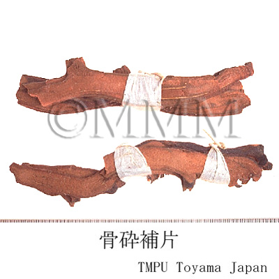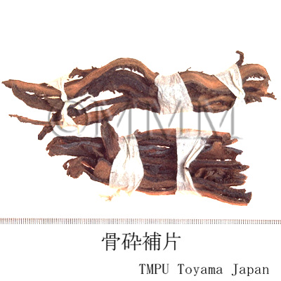 | 備考 | ウラボシ科/Polypodiaceaeの ハカマウラボシ Drynaria fortunei (Kunze) J. Smith の根茎を乾燥したもの(四川省で巴岩姜,吊蘭,屋檐姜,巴毛風,石鶏兒,湖南省や貴州省で爬崖姜,広西省で馬騮姜と称する)が主で,その他 D. sinica Diels (陜西省で猴姜,甘粛省で毛兒姜,駱駝と称する), D. propinqua (Wall.) J. Smith var. mesosoria Christ (四川省で爬岩姜, 石岩姜, 骨砕補と称する), Pseudodrynaria coronans (Wall.) Ching (広西省で骨砕補と称する) などの根茎も用いられる.一般に中国では根茎の鱗片を除去したものを「骨砕補」と称し,鱗片をつけたままのものを「申姜」または「猴姜」と称している. なお, 広西省僮族自治区葯物研究所の方鼎(1962年)は広西省産骨砕補の原植物を調査し, ウラボシ科/Polypodiaceaeの Phymatodes lucida (Roxb.) Ching (広西靖西で猴子姜,骨砕補), シノブ Davallia mariesii Moor., D. austro-sinica Ching, D. formosana Hayata, Drynaria bonii Christ, アリサンデンダ Polypodium amoenum Wall., Colysis elliptica (Thunb.) Ching var. pothifolia (Don) Ching, アリサンオウレンシダ Leucostegia immersa (Wall.) Presl. 広西で骨砕補), Davallia bullata Wall. (広西陸川で骨砕補,砕補), Leucostegia perdurans C. Christ (雲南昆明で骨砕補) を報告している. | |||||