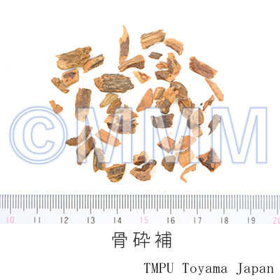 備考ウラボシ科/Polypodiaceaeの ハカマウラボシ Drynaria fortunei (Kunze) J. Smith の根茎を乾燥したもの(四川省で巴岩姜,吊蘭,屋檐姜,巴毛風,石鶏兒,湖南省や貴州省で爬崖姜,広西省で馬騮姜と称する)が主で,その他 D. sinica Diels (陜西省で猴姜,甘粛省で毛兒姜,駱駝と称する), D. propinqua (Wall.) J. Smith var. mesosoria Christ (四川省で爬岩姜, 石岩姜, 骨砕補と称する), Pseudodrynaria coronans (Wall.) Ching (広西省で骨砕補と称する) などの根茎も用いられる.一般に中国では根茎の鱗片を除去したものを「骨砕補」と称し,鱗片をつけたままのものを「申姜」または「猴姜」と称している.