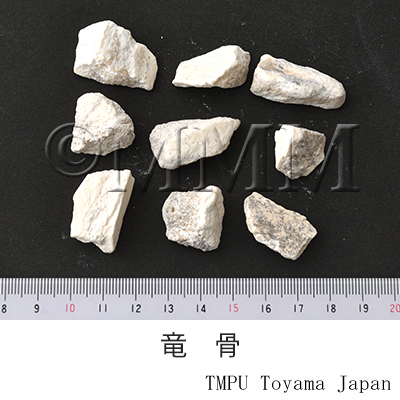 | 備考 | 中国では龍骨を商品上,「花龍骨(五花龍骨)」と「土龍骨」に大別している。 「花龍骨」は華東地区に主産し,表面淡灰白色~淡褐色を帯びた灰色を呈し,灰黒色,褐色,黄色あるいは青色などの斑紋,條紋または松葉紋様の花紋がみられ,質はやや硬いが破砕し易く,容易に崩れて粉末状となる。 「土龍骨」は華北,東北地区に主産し,表面に花紋がなく,断面は中空あるいは多孔質で,質は堅硬で破砕しにくいが,破砕すると小片状となる。「花龍骨」を上品とする。わが国に輸入されているものは主に「土龍骨」である。 | |||