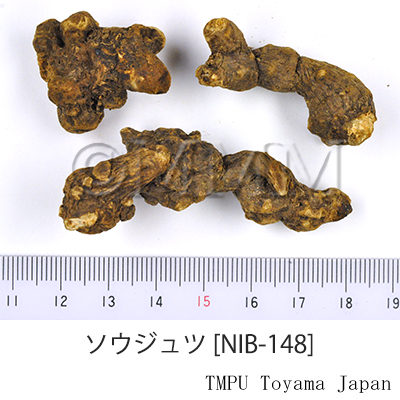 | 備考 | 茅朮(毛朮,漢蒼朮)は A. lancea ホソバオケラ(湖北,江西,江蘇省などに産す),津蒼朮(山蒼朮)は A. chinensis シナオケラ(河北,河南,山西省に産す),北鮮蒼朮は A. koreana Kitam. (= A. lancea DC. var. simplicifolia Kitam.) ナンマンオケラ(吉林,遼寧省,朝鮮半島北部に産す),韓蒼朮は A. japonica Koidz. オケラ(中国東北地方,朝鮮半島,日本に産す)である.江蘇省茅山産の茅朮は品質のよいものとして特に有名である.精油成分が蒼朮の表面に,白色の綿状に析出し,カビと見誤ることが多いが,beta-Eudesmol と Hinesol の混晶であり,良質のものである証拠である. 近年,精油成分の特徴から,A. lancea には茅山型,湖北・安徽型,大別山型があり,A. chinensis には北部型と南部型があることが報告されている.A. lancea, A. chinensis, A. koreana に由来する蒼朮は Atractylodin を共通して含み,これを含まない A. japonica 及び A. ovata 由来の白朮とは明瞭に区別される. | |||||