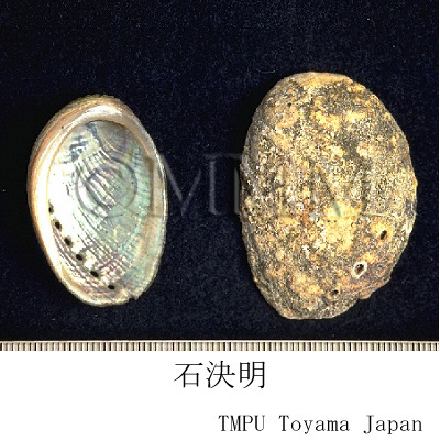 | 備考 | ミミガイ科(Haliotidae)の次の3種のアワビ類の殻が起源とされている. 1.九孔鮑 フクトコブシ Haliotis diversicolor Reeve(別名:光底石決明,九孔螺,鮑魚).福建省,広東省および海南島などの暖海に分布する. 2.盤大鮑 クロアワビ Haliotis discue Reeve (= Notohaliotis discus Reeve) (別名:毛底石決明,石蕨明,朱子房,千里光). 遼寧,山東省沿岸に分布する. 3.羊鮑 マアナゴ Haliotis gigantea Gmelin(別名:台湾石決明).南海一帯に分布する. このほか,大鮑 アワビ Haliotis gigantea Gmelin (大型アワビは現在メカイアワビ Notohaliotis sieboldi Reeve,クロアワビ Notohaliotis discus Reeve,マダカアワビ Notohaliotis gigantea Gmelinに分けられている.) を起源動物とすることもある.日本ではアワビの他トコブシ Haliotis diversicolor aquatilis Reeve (= Sulculus supertexta Lischke) の貝殻も用いられる. | |||||
