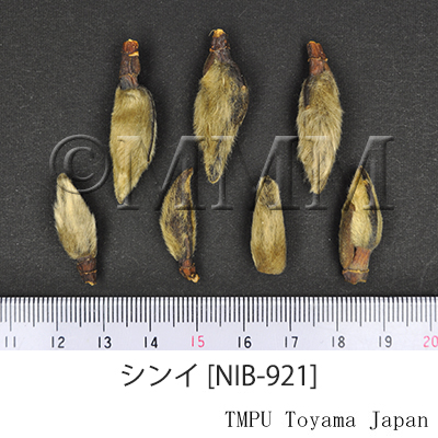 | 備考 | 中国産はモクレン科 Magnolia biondii Pamp.,モクレン M. liliflora Desr.,ハクモクレン M. denudata Desr. などの花蕾を乾燥したものであり,日本に輸入されている辛夷は M. biondii を基源とするものがほとんどである. 日本産はタムシバ M. salicifolia の花蕾を乾燥したものであるが,中国産のものに比べ柔毛が少なく,潤いに欠け品質は劣る.従来和産辛夷は コブシ M. kobus DC. であるとされてきたが,現在市場には見られない. | ||||