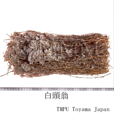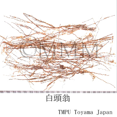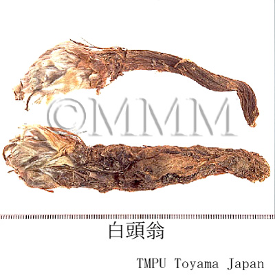 | 備考 | 中国東北諸省では Pulsatilla turczaninovii Krylov et Serg., P. dahurica Spreng., P. koreana Nakai et Mori などの乾燥根を用いる.かつて市場にあった日本産白頭翁は オキナグサ Pulsatilla cernua Spreng. の乾燥根で, 「和秦芁」とも称されたが, 現在は全く市場性がない.また, 韓国産白頭翁は Pulsatilla koreana Nakai et Mori の乾燥根である. 中国で「白頭翁」と称される漢薬は10数種あり, その主なものは, - キンポウゲ科/Ranunculaceae の Anemone tomentosa (Maxim.) Pei (甘粛蘭州, 天水), Anemone sp. (河南鄭州, 陜西) , キブネギク A. japonica (Thunb.) Sieb. et Zucc. (四川重慶), A. vitifolia Buch.-Ham. (河南, 四川, 甘粛, 陜西) , - キク科/Compositae の Inula cappa DC. (福建福州), Artemisia sp. (湖北孝感), Gerbera piloselloides Cass. (雲南昆明, 昭通) , Saussurea radiata Fr. (雲南), オオバアザミ Rhaponticum uniflorum (L.) DC. (河南, 内蒙古, 東北諸省, 山西, 陜西, 湖北), Gnaphalium hypoleucum DC. (四川), G. indicum L. (広西), Anaphalis margaritacea Benth. et Hook. (四川成都), Leontopodium leontopodioides (Willd.) Blauv. (東北安東市), - バラ科/Rosaceae の Potentilla chinensis Ser. (湖北襄陽, 武漢, 南京市), P. discolor Bunge (南京市, 上海市, 湖北, 福州, 北京, 浙江蘭谿), - ナデシコ科/Caryophyllaceae の Polycarpaea corymbosa Lam. (広東陽江, 南路) などの根または全草である. | |||||