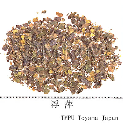 | 備考 | 香港市場の広東,広西省産の大型の「浮萍」はサトイモ科のボタンウキクサ Pistia stratiotes L. の全草を乾燥したもの.浮萍草とも称す. 北方系の小型の浮萍中にはウキクサ以外にアオウキクサ属のコウキクサ Lemna minor L. および L. paucicostata Hegelmaier が混入されるといわれているが,木村らの調査によるとウキクサただ1種である. また,石戸谷によると朝鮮半島産の浮萍には デンジソウ科のデンジソウ Marsilia quadrifolia L. がある | |||||