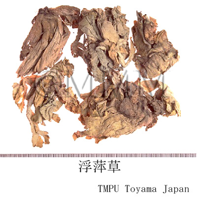 | 備考 | 香港市場の広東,広西省産の大型の「浮萍」はサトイモ科のボタンウキクサ Pistia stratiotes L. の全草を乾燥したもの.浮萍草とも称す. 北方系の小型の浮萍中にはウキクサ以外にアオウキクサ属のコウキクサ Lemna minor L. および L. paucicostata Hegelmaier が混入されるといわれているが,木村らの調査によるとウキクサただ1種である. また,石戸谷によると朝鮮半島産の浮萍には デンジソウ科のデンジソウ Marsilia quadrifolia L. がある | |||||