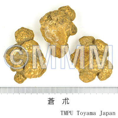 備考茅朮(毛朮,漢蒼朮)は A. lancea ホソバオケラ(湖北,江西,江蘇省などに産す),津蒼朮(山蒼朮)は A. chinensis シナオケラ(河北,河南,山西省に産す),北鮮蒼朮は A. koreana Kitam. (= A. lancea DC. var. simplicifolia Kitam.) ナンマンオケラ(吉林,遼寧省,朝鮮半島北部に産す),韓蒼朮は A. japonica Koidz. オケラ(中国東北地方,朝鮮半島,日本に産す)である.江蘇省茅山産の茅朮は品質のよいものとして特に有名である.精油成分が蒼朮の表面に,白色の綿状に析出し,カビと見誤ることが多いが,beta-Eudesmol と Hinesol の混晶であり,良質のものである証拠である.