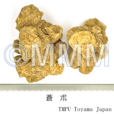 | 備考 | 茅朮(毛朮,漢蒼朮)は A. lancea ホソバオケラ(湖北,江西,江蘇省などに産す),津蒼朮(山蒼朮)は A. chinensis シナオケラ(河北,河南,山西省に産す),北鮮蒼朮は A. koreana Kitam. (= A. lancea DC. var. simplicifolia Kitam.) ナンマンオケラ(吉林,遼寧省,朝鮮半島北部に産す),韓蒼朮は A. japonica Koidz. オケラ(中国東北地方,朝鮮半島,日本に産す)である.江蘇省茅山産の茅朮は品質のよいものとして特に有名である.精油成分が蒼朮の表面に,白色の綿状に析出し,カビと見誤ることが多いが,beta-Eudesmol と Hinesol の混晶であり,良質のものである証拠である. 近年,精油成分の特徴から,A. lancea には茅山型,湖北・安徽型,大別山型があり,A. chinensis には北部型と南部型があることが報告されている.A. lancea, A. chinensis, A. koreana に由来する蒼朮は Atractylodin を共通して含み,これを含まない A. japonica 及び A. ovata 由来の白朮とは明瞭に区別される. | |||||