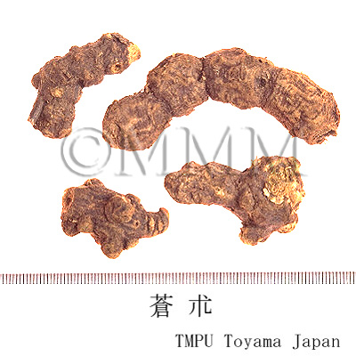 備考茅朮(毛朮,漢蒼朮)は A. lancea ホソバオケラ(湖北,江西,江蘇省などに産す),津蒼朮(山蒼朮)は A. chinensis シナオケラ(河北,河南,山西省に産す),北鮮蒼朮は A. koreana Kitam. (= A. lancea DC. var. simplicifolia Kitam.) ナンマンオケラ(吉林,遼寧省,朝鮮半島北部に産す),韓蒼朮は A. japonica Koidz. オケラ(中国東北地方,朝鮮半島,日本に産す)である.江蘇省茅山産の茅朮は品質のよいものとして特に有名である.精油成分が蒼朮の表面に,白色の綿状に析出し,カビと見誤ることが多いが,beta-Eudesmol と Hinesol の混晶であり,良質のものである証拠である.