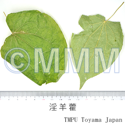| 備考 | 『中華人民共和国薬典』 (2020) には「淫羊藿」として Epimedium brevicornum Maxim., E. sagittatum Maxim., E. pubescense Maxim., E. koreanum Nakai の地上部が規定される. 中国四川省産の淫羊藿は E. pubescens, E. acuminatum Franch., E. wushanense, E. sutchuenense Franch. and E. davidii Franch.などが主流である. 中国東北部および朝鮮半島北部産淫羊藿は E. koreanum Nakai およびキバナイカリソウ E. cremeum Nakai であろう. 日本産はイカリソウ E. grandiflorum Morr. var. thunbergianum Nakai (長野県産) およびウラジロイカリソウ E. sempervirens Nakai var. hypoglaucum Ohwi (新潟県産)の 葉または地上部を乾燥したもの.日本では地下部を「イカリソウ根」と称して別に市販される (B2). | ||||||