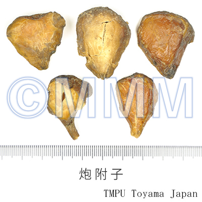 - 炮附子: 塩附子の外皮を剥ぎ2縦割して乾燥したもの.