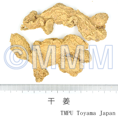 備考古来,漢方処方で用いられる生姜は,いわゆる新鮮なショウガのことで,乾姜は乾燥品である.したがって,漢薬市場の乾燥した生姜(乾生姜とも称す)は,漢方でいう乾姜を指す.では市場の乾姜は何かというと,生姜を蒸乾したもので,修治品(加工品)といえる.一方,現在中国では新鮮なものが生姜で,乾燥品が乾姜である.また修治品として炮姜がある.炮姜は先ずきれいな砂(蛤粉,滑石粉)を鍋に入れ,強火で熱した後,乾燥した皮付き生姜を入れて攪拌し,表面が盛り上がって褐色になったら取出し放冷したものである.