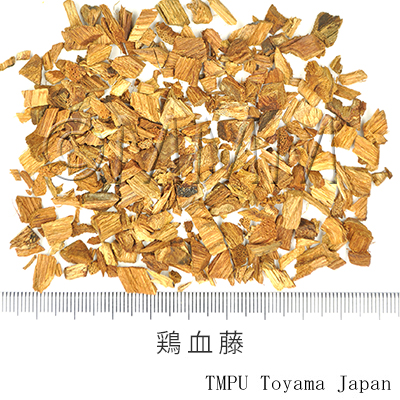 | 備考 | 広東,広西の一部の地区では,マメ科の Millettia nitida Benth. の茎を鶏血藤,血節藤,血藤,血筋藤などと称する.また江西省の豊城,雲南省鳳慶,四川省などに産する鶏血藤は Millettia dielsiana Harms の茎であり,豊城鶏血藤(江西),貫腸血藤(四川)とも称する.その他鶏血藤と称する商品は非常に種類が多い. 江西,陜西,河北,山東,山西,内蒙古,東北諸省などでは 血藤科/Sargentodoxaceae の Sargentodoxa cuneata (Oliv.) Rehd. et Wils. (= Holboellia cuneata Oliv.) 大血藤の茎を「鶏血藤」として用いる場合があるが,このものは元来大血藤,紅藤,活血藤,大活血,花血藤,血藤,血木通などと称するもので,混用すべきものではない. | |||||