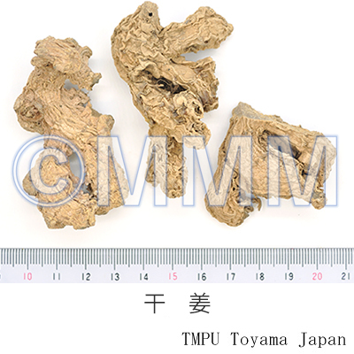 備考古来,漢方処方で用いられる生姜は,いわゆる新鮮なショウガのことで,乾姜は乾燥品である.したがって,漢薬市場の乾燥した生姜(乾生姜とも称す)は,漢方でいう乾姜を指す.では市場の乾姜は何かというと,生姜を蒸乾したもので,修治品(加工品)といえる.一方,現在中国では新鮮なものが生姜で,乾燥品が乾姜である.また修治品として炮姜がある.炮姜は先ずきれいな砂(蛤粉,滑石粉)を鍋に入れ,強火で熱した後,乾燥した皮付き生姜を入れて攪拌し,表面が盛り上がって褐色になったら取出し放冷したものである.