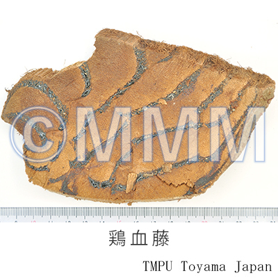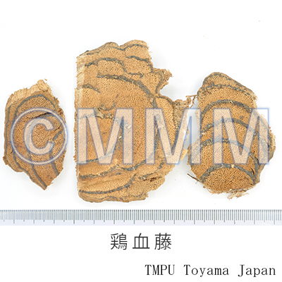 | 備考 | 広東,広西の一部の地区では,マメ科の Millettia nitida Benth. の茎を鶏血藤,血節藤,血藤,血筋藤などと称する.また江西省の豊城,雲南省鳳慶,四川省などに産する鶏血藤は Millettia dielsiana Harms の茎であり,豊城鶏血藤(江西),貫腸血藤(四川)とも称する.その他鶏血藤と称する商品は非常に種類が多い. 江西,陜西,河北,山東,山西,内蒙古,東北諸省などでは 血藤科/Sargentodoxaceae の Sargentodoxa cuneata (Oliv.) Rehd. et Wils. (= Holboellia cuneata Oliv.) 大血藤の茎を「鶏血藤」として用いる場合があるが,このものは元来大血藤,紅藤,活血藤,大活血,花血藤,血藤,血木通などと称するもので,混用すべきものではない. | |||||