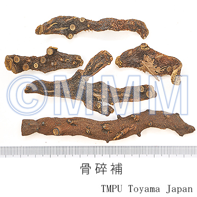 | 備考 | ウラボシ科/Polypodiaceaeの ハカマウラボシ Drynaria fortunei (Kunze) J. Smith の根茎を乾燥したもの(四川省で巴岩姜,吊蘭,屋檐姜,巴毛風,石鶏兒,湖南省や貴州省で爬崖姜,広西省で馬騮姜と称する)が主で,その他 D. sinica Diels (陜西省で猴姜,甘粛省で毛兒姜,駱駝と称する), D. propinqua (Wall.) J. Smith var. mesosoria Christ (四川省で爬岩姜, 石岩姜, 骨砕補と称する), Pseudodrynaria coronans (Wall.) Ching (広西省で骨砕補と称する) などの根茎も用いられる.一般に中国では根茎の鱗片を除去したものを「骨砕補」と称し,鱗片をつけたままのものを「申姜」または「猴姜」と称している. なお, 広西省僮族自治区葯物研究所の方鼎(1962年)は広西省産骨砕補の原植物を調査し, ウラボシ科/Polypodiaceaeの Phymatodes lucida (Roxb.) Ching (広西靖西で猴子姜,骨砕補), シノブ Davallia mariesii Moor., D. austro-sinica Ching, D. formosana Hayata, Drynaria bonii Christ, アリサンデンダ Polypodium amoenum Wall., Colysis elliptica (Thunb.) Ching var. pothifolia (Don) Ching, アリサンオウレンシダ Leucostegia immersa (Wall.) Presl. 広西で骨砕補), Davallia bullata Wall. (広西陸川で骨砕補,砕補), Leucostegia perdurans C. Christ (雲南昆明で骨砕補) を報告している. | |||||