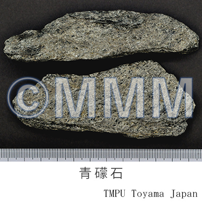 | 原植物名 | 点紋緑泥片岩 spotted chlorite schist, 即ち緑泥石 chlorite (イノ珪酸塩鉱)に曹長石 albite を混じたもの. |