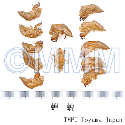 | 原植物名 | Cryptotympana atrata Stal1, Platylomia pieli Kato, Oncotympana maculaticollis Distant2, Tanna chekiangensis Ouchi, Graptopsaltria tienta Karsch, Lyristes pekinensis Haupt, Lyristes atrofasciatus Chou et Lei, Meimuna mongolica Distant3, Leptosemia sakaii Matsumura4, Platypleura kaempferi Butler5, またはそれらの同属動物 (スジアカクマゼミ1, ミンミンゼミ2, コマゼミ3, ホソヒグラシ4, ニイニイゼミ5) | |||||