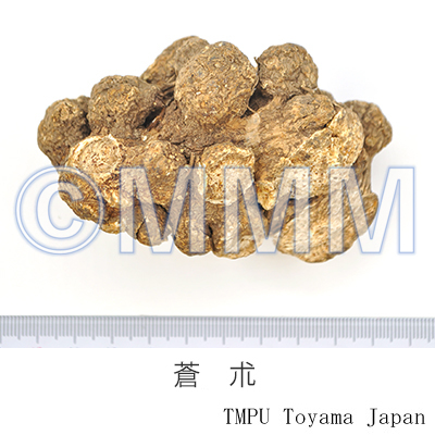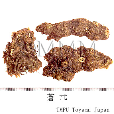 備考茅朮(毛朮,漢蒼朮)は A. lancea ホソバオケラ(湖北,江西,江蘇省などに産す),津蒼朮(山蒼朮)は A. chinensis シナオケラ(河北,河南,山西省に産す),北鮮蒼朮は A. koreana Kitam. (= A. lancea DC. var. simplicifolia Kitam.) ナンマンオケラ(吉林,遼寧省,朝鮮半島北部に産す),韓蒼朮は A. japonica Koidz. オケラ(中国東北地方,朝鮮半島,日本に産す)である.江蘇省茅山産の茅朮は品質のよいものとして特に有名である.精油成分が蒼朮の表面に,白色の綿状に析出し,カビと見誤ることが多いが,beta-Eudesmol と Hinesol の混晶であり,良質のものである証拠である.
