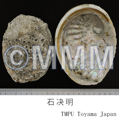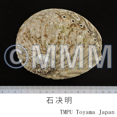 | 備考 | ミミガイ科(Haliotidae)の次の3種のアワビ類の殻が起源とされている. 1.九孔鮑 フクトコブシ Haliotis diversicolor Reeve(別名:光底石決明,九孔螺,鮑魚).福建省,広東省および海南島などの暖海に分布する. 2.盤大鮑 クロアワビ Haliotis discue Reeve (= Notohaliotis discus Reeve) (別名:毛底石決明,石蕨明,朱子房,千里光). 遼寧,山東省沿岸に分布する. 3.羊鮑 マアナゴ Haliotis gigantea Gmelin(別名:台湾石決明).南海一帯に分布する. このほか,大鮑 アワビ Haliotis gigantea Gmelin (大型アワビは現在メカイアワビ Notohaliotis sieboldi Reeve,クロアワビ Notohaliotis discus Reeve,マダカアワビ Notohaliotis gigantea Gmelinに分けられている.) を起源動物とすることもある.日本ではアワビの他トコブシ Haliotis diversicolor aquatilis Reeve (= Sulculus supertexta Lischke) の貝殻も用いられる. | |||||