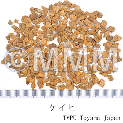 | 備考 | 中国では C. cassia の樹皮を「肉桂」(rougui),嫩枝を「桂枝」(guizhi)と称し,薬効を異にする.肉桂は温裏薬(伝統医学的薬効を参照),桂枝は辛温解表薬で薬効は次のとおり:発汗解肌,温通経脈,助陽化気,平冲降気.風寒感冒,腹(胃)部冷痛,血寒経閉,関節痺痛,痰飮,水腫、心悸,奔豚に応用する.日本における用法は「桂枝」に近い. 「セイロン桂皮」は,C. verum J.S. Presl の幹皮で,Cinnamon Bark と称され,香辛料として世界的に有名である.「タイ桂皮」は,C. iners Reinw. ex Blume,「ジャワ桂皮」は,C. burmanni Blume に由来するものとされる.日本産の「肉桂(にっけい)」と称されるものは C. sieboldii Meissn ニッケイの根皮である. - 日本薬局方での学名変更 JP17: Cinnamomum cassia Blume → JP18: C. cassia J. Presl | |||||