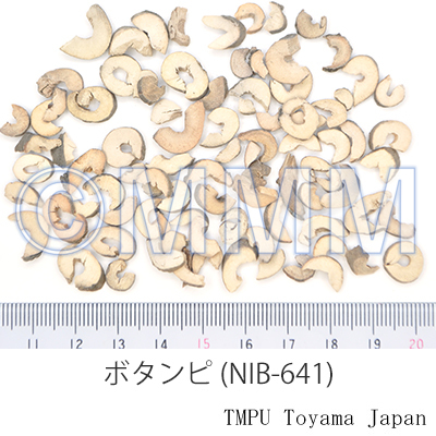 | 備考 | ボタンには多くの品種があり,牡丹皮の基源は複雑で,成分組成や含量も品種により少しずつ異なる.奈良県産の芯抜き品が上品である.中国では安徽省銅陵鳳凰山に産するものが品質最良とされ「鳳凰牡丹皮」,「鳳丹皮」と称される.『日本薬局方』第17改正では,Paeonol を1.0%以上含むことであったが,第18改正では0.9%以上含むことが規定される. | |||||