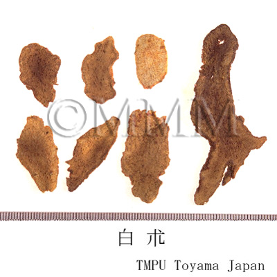 | 備考 | 日本及び韓国産は Atractylodes japonica の根茎の周皮を除いたもので,「三好白朮」,「玉白朮」,「嫩根白朮」などと称する.中国産白朮はすべて Atractylodes macrocephala を基源とし,産地及び加工法の違いにより「浙朮」,「天生朮」,「冬朮」,「野朮」など多様な呼称がある.『中華人民共和国薬典』に規定される白朮 (Atractylodis Macrocephalae Rhizoma, Largehead Atractylodes Rhizome) はこのものである.日本産白朮を「和白朮」,中国産白朮を「唐白朮」ともいう.2種ともに精油の主成分は atractylone である. 白朮とその同類生薬である蒼朮の薬効については,その健脾,燥湿を目的とするのは同じであるが,白朮は健脾(健胃)の力が比較的強く,蒼朮は燥湿(利水,利尿,発汗)の力が優るとされている.そのため,脾弱の虚証には白朮を用い,温盛の実証には蒼朮を多く用いる. | |||||