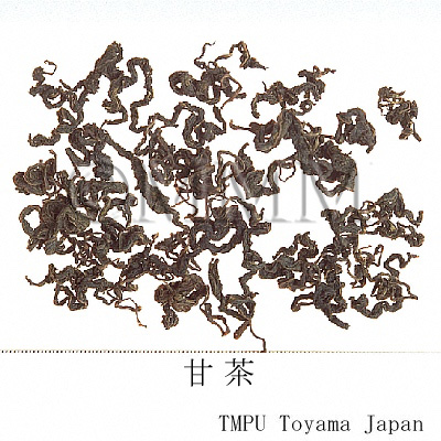 | 備考 | 葉はもんでやや発酵させたもので,加工過程上ちぢれている.生の葉には甘味は無く,発酵させ手でもむ等の調製により,加水分解生成物 phyllodulcin (甘味成分) が生じる.アマチャは江戸時代にその煎汁を灌仏会 (4月8日) の甘茶湯として用いたもので,薬用の歴史は浅い. | |||||